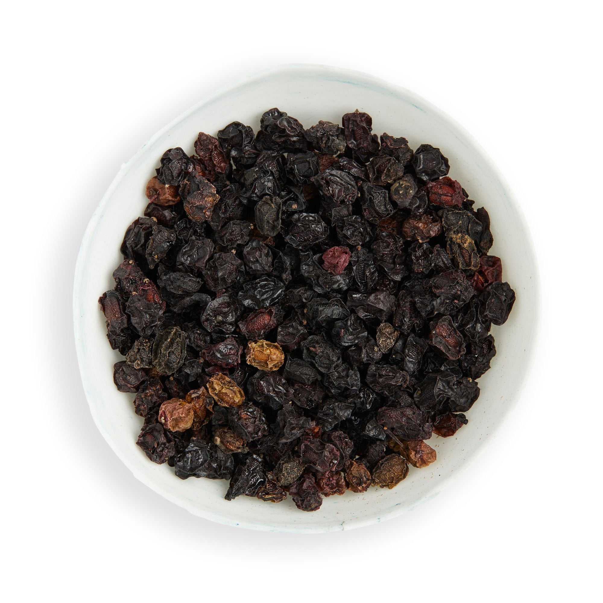 Dried elderberries, packed in renewable, plant-sourced packaging.