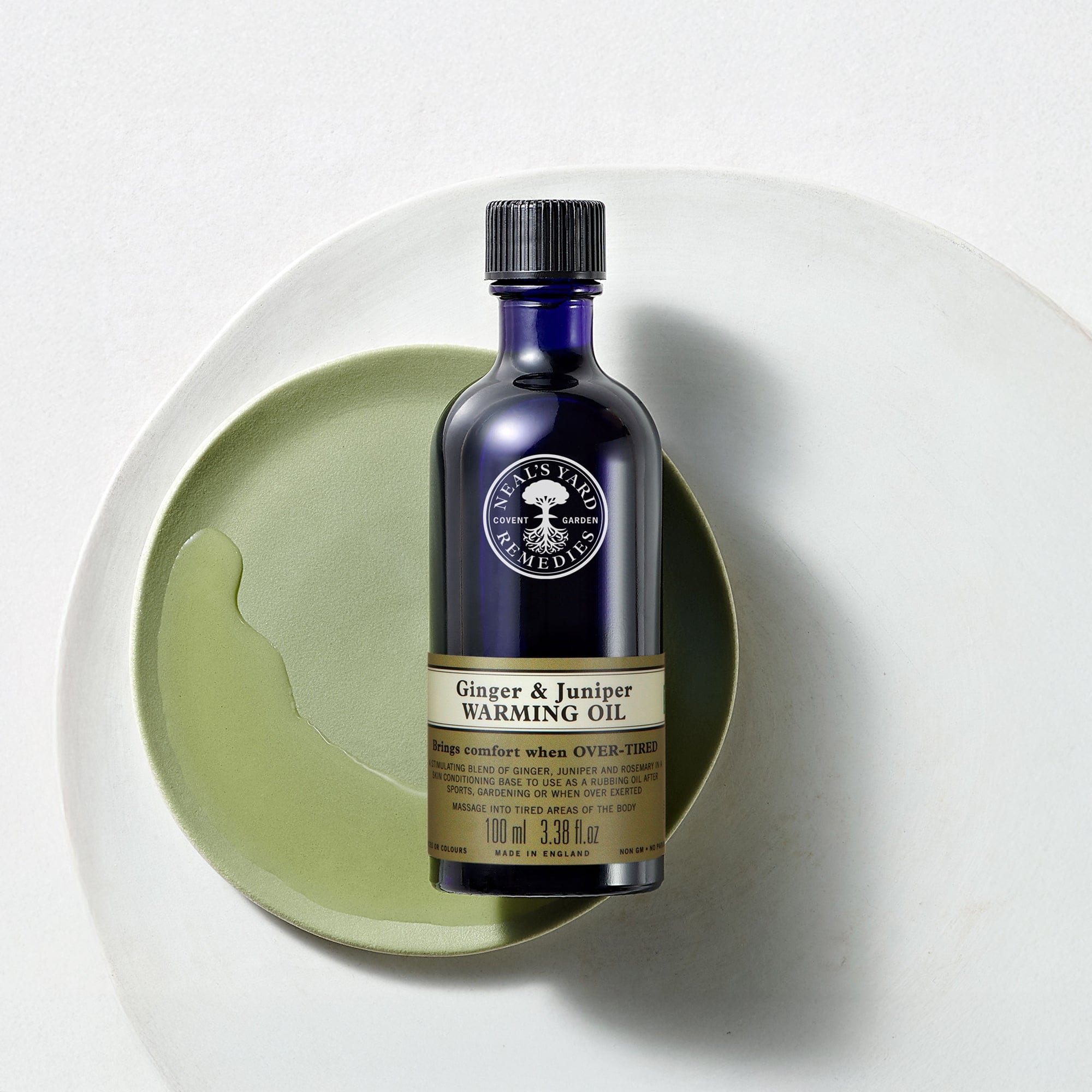 A warming oil infused with a 100% organic blend of ginger, juniper, and rosemary in a skin-conditioning sunflower oil base.