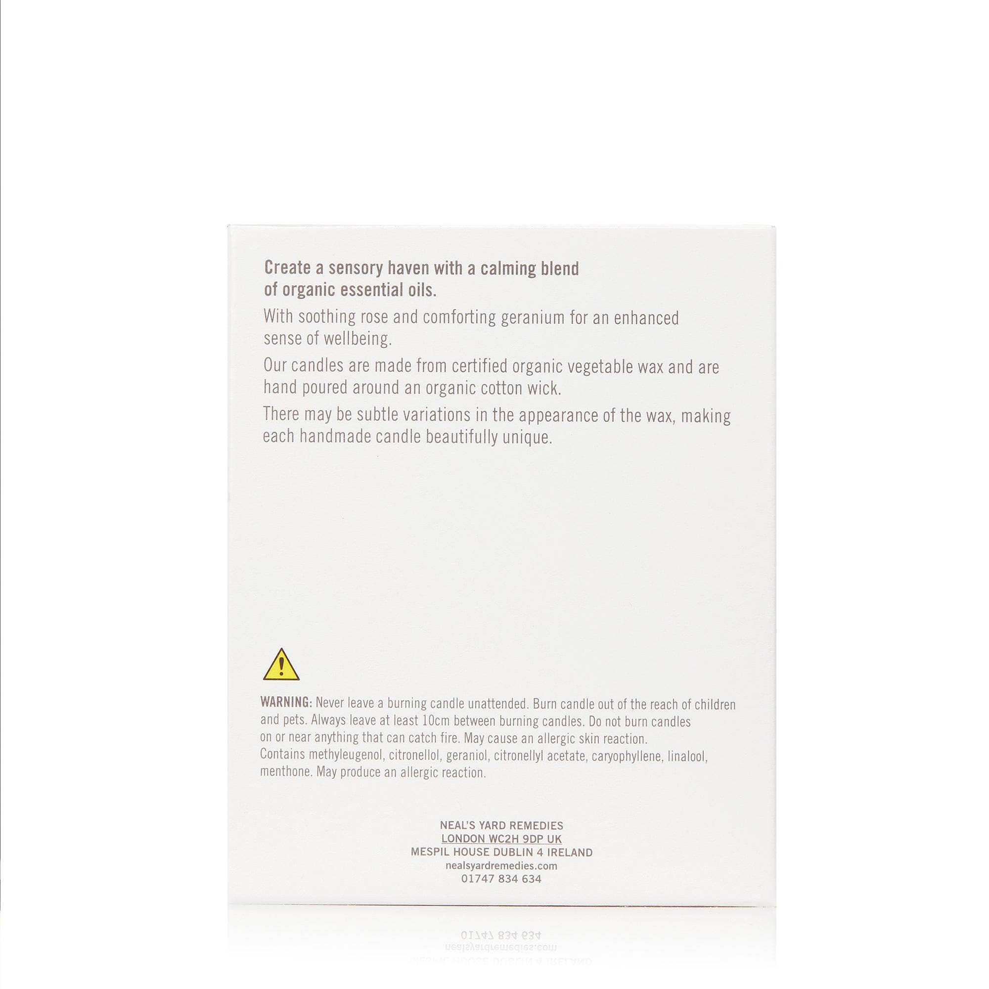 Warning: Never leave a burning candle unattended. Burn candle out of reach of children and pets. Always leave at least 10cm between burning candles. Do not burn candles on or near anything that can catch fire. Contains alpha-terpineol, carophyllene, linalyl acetate, p-menta-1,4-diene, alpha pinene, beta pinene, geraniol, linalool, limonene. May produce an allergic reaction to the skin.