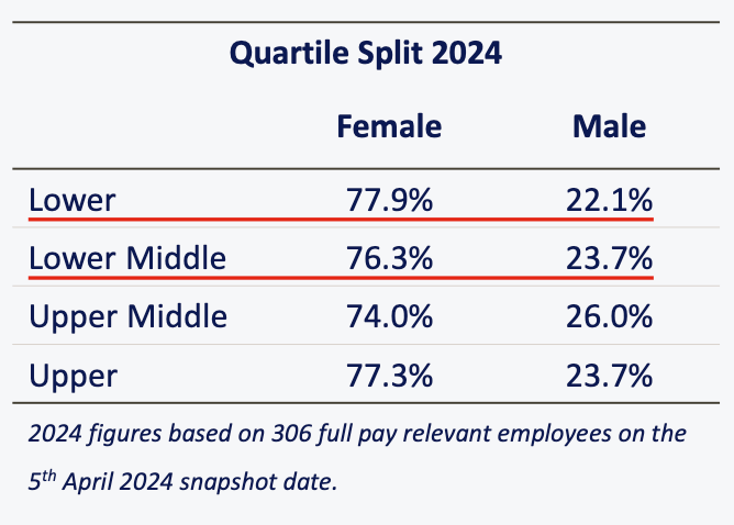 The majority of our staff are female. In previous years, we have seen a lower number of females in the upper earnings quartile and our focus this year has been to create opportunities for more women to move into roles through internal promotions, where these roles have typically been held by men. Creating more balance across our leadership structure.